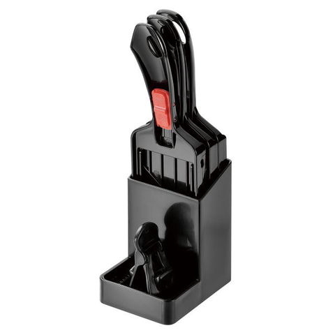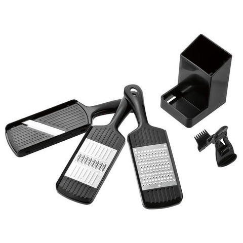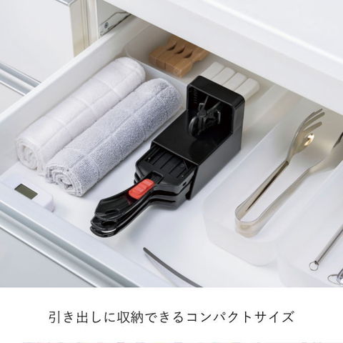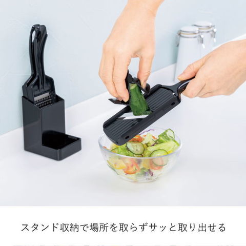 | 3種類の調理がこれひとつでできる。 スタンド収納で場所を取らずサッと取り出せる スライサー・千切り・薬味おろし・ホルダー付き |