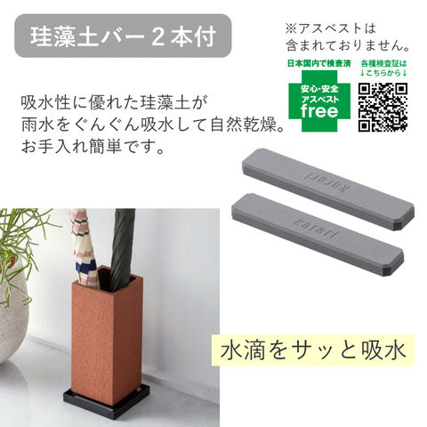 | 珪藻土トレーを搭載した、アンブレラスタンド ※アスベスト含有無し商品 ※傘の大きさにより収納本数が変わります。 本体は木と樹脂を合わせた「ポリウッド製」 ウッドデッキなどに使われ、耐水性、耐久性に優れる。 木の質感そのままに、玄関まわりをスタイリッシュに演出。 傾斜付き「PPトレー」 珪藻土バーに向かって傾斜が付いており、傘の水滴がスムーズに珪藻土に流れる設計。 滑り止めEVAシート付。 |