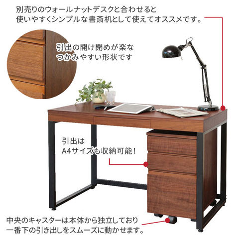 | ウォールナット材使用デスクチェスト 引き出し部分はつかみやすい形状。開け閉めが楽です。 中央のキャスターは本体から独立しており一番下の引き出しをスムーズに動かせます。 A4収納可能。ロック付キャスター2カ所。 2022/02/24にマイナーチェンジ | |