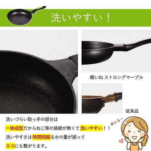 | 手に持っただけで、驚きの軽さ! 調理中、フライパンが重くて嫌だなと思った方、ぜひ一度お試しください。本当に驚きの軽さです。軽いだけではありません。 内面4層外面3層強力コーティングで、傷にも強く、金属ヘラ(角が丸い滑らかなもの)も使用できる。 フライパンの内面はもちろんの事、フライパンの外面にもマーブル加工が施されているので、汚れもサッと落ちる。 内面に出っ張り(リベット)がなく、本体と一体成型ですので、洗いやすい。 ※ガス火専用のフライパン |