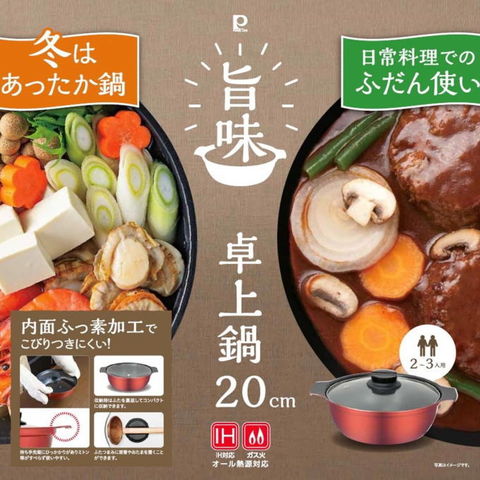 | ◆優れた耐久性でキズに強い、内面フッ素コーティング。 ◆トマト鍋やカレー鍋、キムチ鍋などベッタリこびりつきやすいお鍋からよせ鍋などの定番のお鍋まで、いろいろなメニューを楽しめます ◆ガス火はもちろん、IHクッキングヒーターやハロゲンヒーターなどオール熱源に対応しているので、カセットコンロ・IH調理器を使って卓上で楽しめます。 ◆2~3人用サイズ。 ◆中の様子が見えるガラス蓋付。 ◆ガラス蓋のツマミは菜箸やお玉が置ける形状になっています。 ※2023/10/30 仕様変更 |