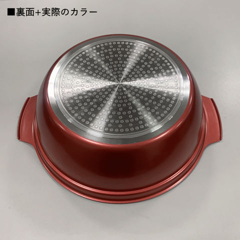 | 表面加工:内面/ふっ素樹脂塗膜加工、外面/焼付塗装、素材・材質:本体/アルミニウム合金、はり底/ステンレス鋼(クロム16%) 強化の種類:全面物理強化、その他の材料:縁リング/ステンレス鋼、つまみ・つまみの座板/フェノール樹脂(耐熱温度150度) |