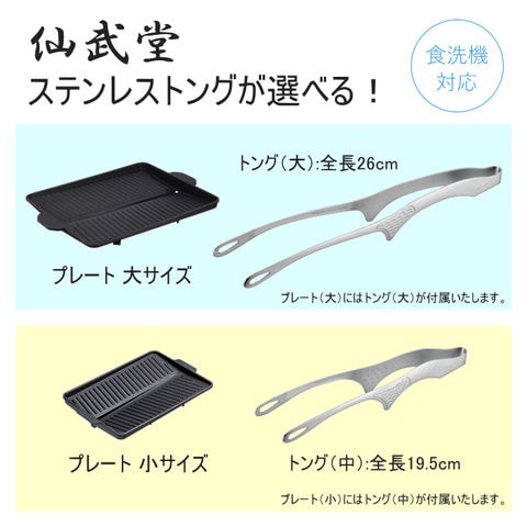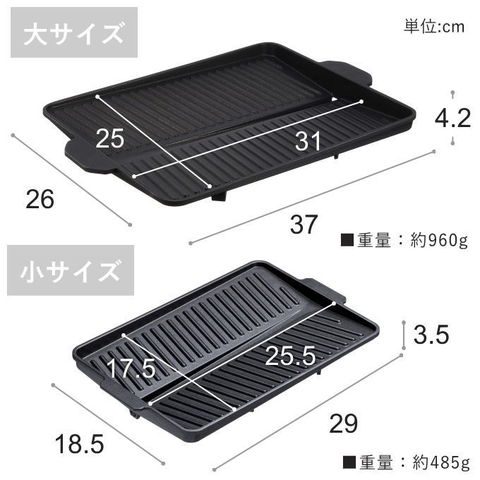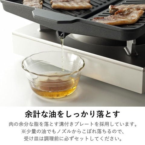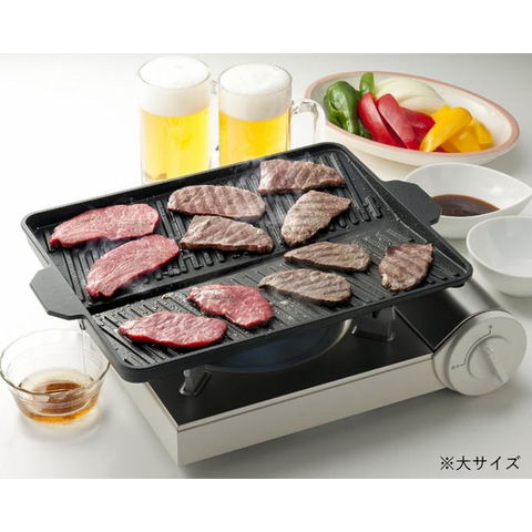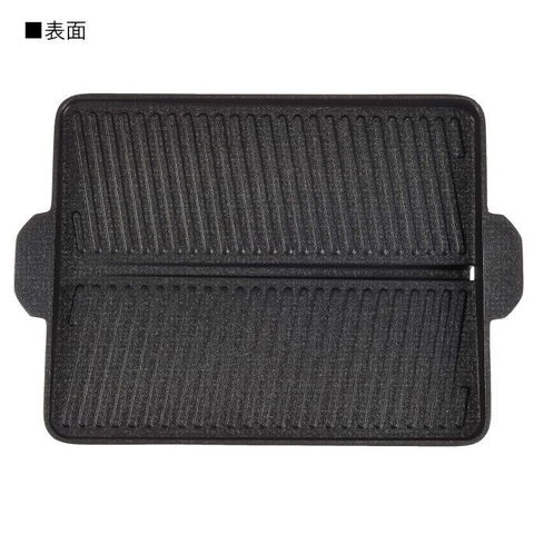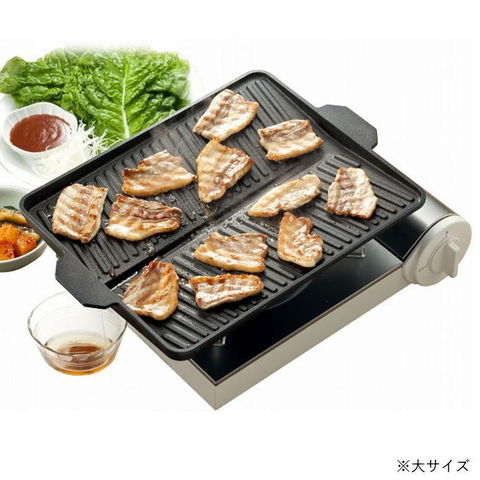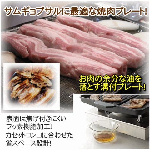 サムギョプサルに最適な焼肉プレート! サムギョプサル→「サム」=数字の3、「ギョプ」=層、「サル」=肉 韓国でポピュラーな豚バラ肉の焼肉料理。 豚肉をカリカリに焼き、ナムル、キムチ、白髪ネギと一緒にチシャバに包んで味噌ダレやごま油をつけて食べる料理です。 油の多い豚バラ肉の油を落とし、野菜と一緒に食べられるので、 よりヘルシーです! ●お肉の余分な油を落とす溝付プレート! (油を溜めないことで野菜を焼く時に油の飛び散りを抑えます) ●集めた油はプレートの外へ流れる設計! ●表面は焦げ付きにくいフッ素樹脂加工! ●カセットコンロに合わせた省スペース設計! | |