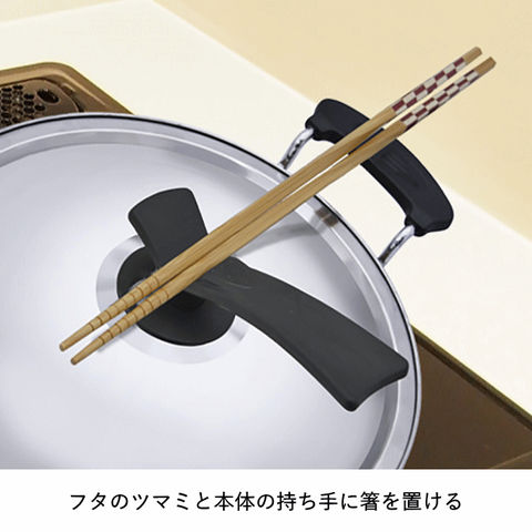 | スタンド式のツマミだから、蓋を立てて置ける。 フタのツマミと本体の持ち手に箸を置ける。 |