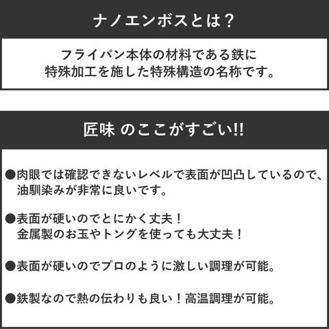 | 『ナノエンボス』採用!耐久性が高く長持ちするフライパン。 ナノエンボス加工により表面の凹凸が均一になり油なじみがよくなり焦げ付きにくくなります。 ナノエンボスとは? フライパン本体の材料である鉄に特殊加工を施した特殊構造の名称です。 ●肉眼では確認できないレベルで表面が凹凸しているので、油馴染みが非常に良いです。 ●表面が硬いのでとにかく丈夫!金属製のお玉やトングを使っても大丈夫! ●表面が硬いのでプロのように激しい調理が可能。 ●鉄製なので熱の伝わりも良い!高温調理が可能。 |