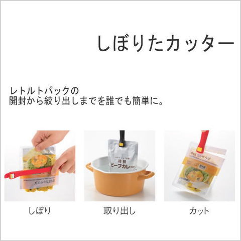 | 袋入りの惣菜やレトルトパックの開封&中身の絞り出しが気持ちよくできます。 挟んで袋をカットできる収納刃付。 |