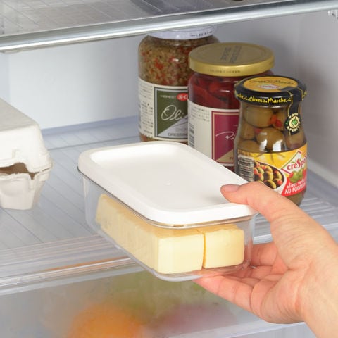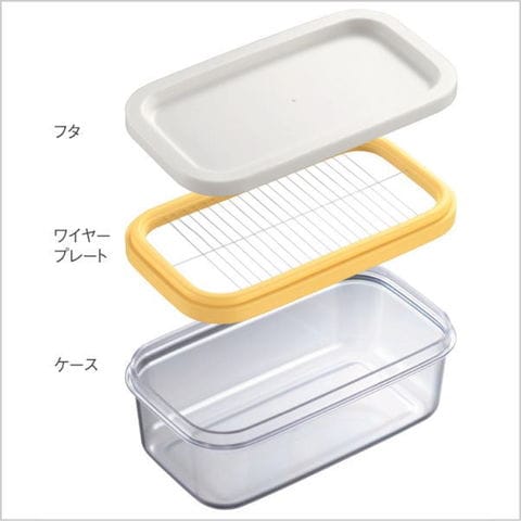 | 市販のバターは、箱やアルミフィルムが傷みやすくなかなかきれいに使えないものです。 「カットできちゃうバターケース」なら、手に触れずにギュッと一押しで約5gのうす切りにカットでき、そのまま冷蔵庫にストックできます。 約5gと小さくカットできるので、お菓子作りやホームベーカリーの計量にとても便利! また、うす切りなのでホットケーキなどにのせても溶けやすくて便利です。 |