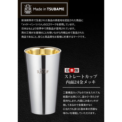| 新潟県燕市で生産された製品の原産地を認証された商品に「メイド・イン・ツバメ」のロゴマークを使用しています。日本はもとより世界中で燕製品が愛用されています。燕の工場がお客様のことを想いながら丹精込めて製造された商品であること。安心と高品質をお客様に約束するマークです。 二重構造カップなので氷を入れても結露が出来にくく、温かさ・冷たさが長持ちします。更に内面に24金メッキを施してあるので金属臭がなく口当たりも良くお酒本来の芳醇な味わいを堪能していただけます。 食洗機使用不可(本体の錆・24Kメッキの変色) |