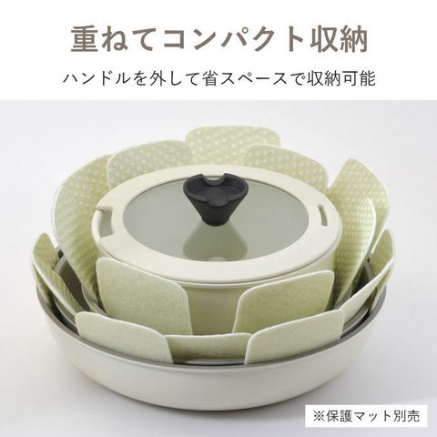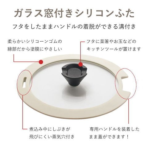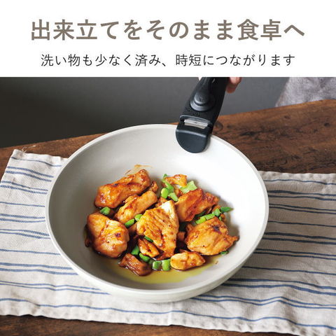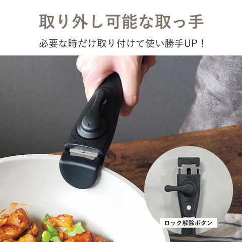 | ハンドルが外せる快適クックウェア!外せるハンドルで便利がいっぱい。 ハンドルを外してオーブン調理OK!調理できたらそのまま食卓へ出せます。洗いも簡単。コンパクトに収納できるので場所をとりません。 ハンドルは安心の2重ロック構造。 収納に便利な着脱ハンドル式 着脱式ハンドルの採用により、重ねてコンパクトに収納できます。ハンドルを外せばオーブン料理もでき、料理の幅が広がります。「そのまま食卓」も可能にした便利なクッキングウェアです。 耐久性抜群! フライパンは内面ふっ素加工、マルチポットは内面セラミック加工で汚れがこびりつきにくいコーティングを施しています。 少量の油で調理可能なヘルシークッキングを実現しました。 ガス火・IH対応! ガス火はもちろん、IH100/200Vをはじめ、全ての熱源に対応可能です。 ガラス蓋は柔らかいシリコーンゴムの縁でマルチポットのコーティングに優しい仕様です。 マルチポット用シール蓋は料理の一時保管に便利。 |