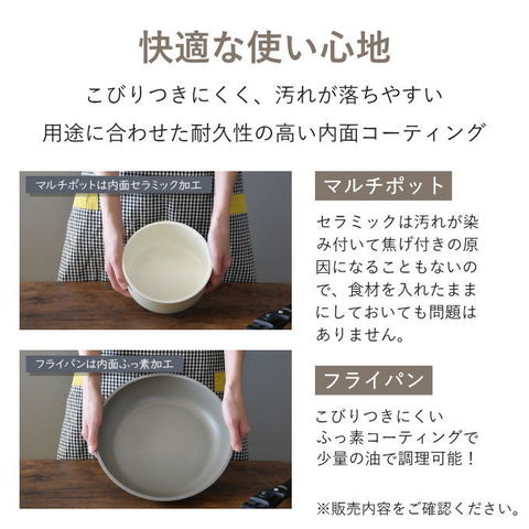 | 【フライパン】表面加工:内面/ふっ素樹脂塗膜加工、外面/焼付け塗装、素材・材質:本体/アルミニウム合金、はり底/ステンレス鋼 【マルチポット】表面加工:内面/セラミック塗膜加工、外面/焼付け塗装、素材・材質:本体/アルミニウム合金、はり底/ステンレス鋼(クロム16%)(底の厚さ2.3mm) 【ガラス蓋】蓋:強化ガラス製器具、強化の種類:全面物理強化、その他の材料/縁部:シリコーンゴム(耐熱温度200度)、つまみ:フェノール樹脂(耐熱温度150度) 【ハンドル】素材・材質:樹脂部/フェノール樹脂(耐熱温度150度)、レバー/ナイロン(耐熱温度180度)、ロック解除ボタン/ABS樹脂(耐熱温度80度)、パッキン/シリコーンゴム(耐熱温度250度)、金属部/ステンレス鋼 |