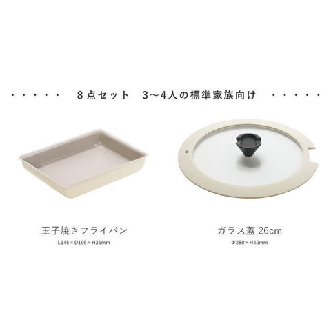 | 【3点セット】 1.フライパン20cm 2.フライパン26cm 3.専用ハンドル 【6点セット】(+3点セット内容) 4.マルチポット18cm 5.マルチポット用シール蓋18cm 6.ガラス蓋18cm 【8点セット】(+6点セット内容) 7.玉子焼きパン13×18cm 8.ガラス蓋26cm |