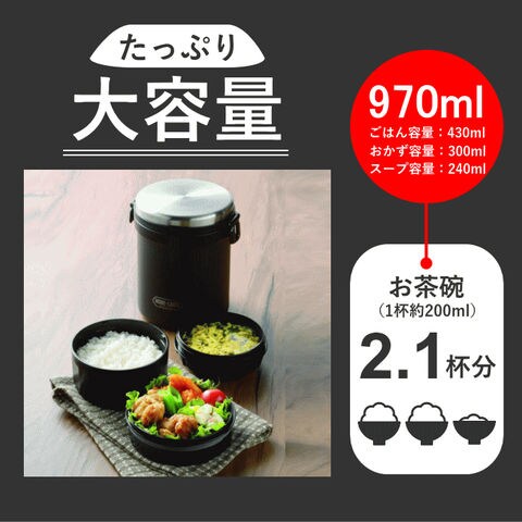 | ●ほかほかのお弁当でおいしさアップ!みそ汁やスープもほかほか♪ ●暑い時期は温度をキープして、傷みやすいおかずを守る。冷たい麺類や冷やしたサラダやフルーツなどにも使える! ●ご飯容器は茶碗約2.1杯分 ●ご飯容器・おかず容器・スープ容器はふたをはずせば電子レンジOK! |
