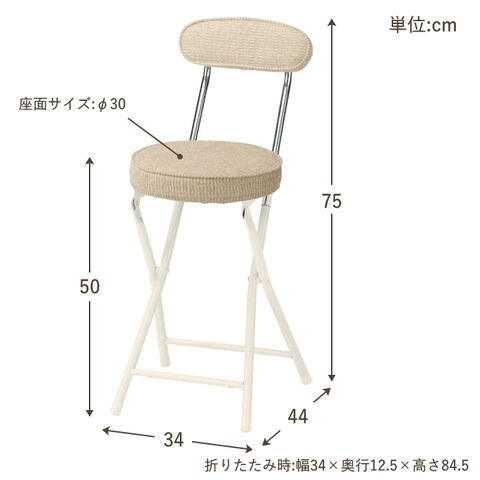 | サイズ | (約)幅340×奥行440×高さ750(座面高:500)mm 座面サイズ:(約)φ300mm 折りたたみ時:(約)幅340×奥行125×高さ845mm |