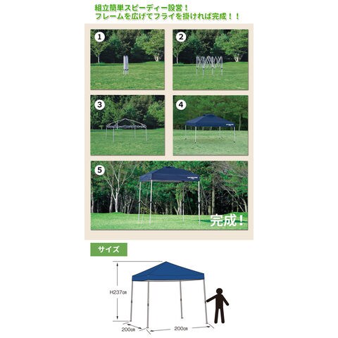 ◆組立簡単なワンタッチタープ! ◆フリーマーケットや町内会・祭事などのイベントやレジャーでリビングスペースが確保できます! ◆200×200cm、約2.5畳のスペースで3~4人に最適! ◆フライシートにはポリエステル150DにUVプロテクション加工、裏面は紫外線を99%カットするシルバーコーティング、防水1,000mmを施しています。 ◆フライ天井部に装備したベンチレーションで風をコントロールすることでタープの下で快適に過ごせます。 ◆支柱フレームに、軽量なアルミニウムを使用し、表面は錆やキズに強いパウダーコーティング塗装。 |