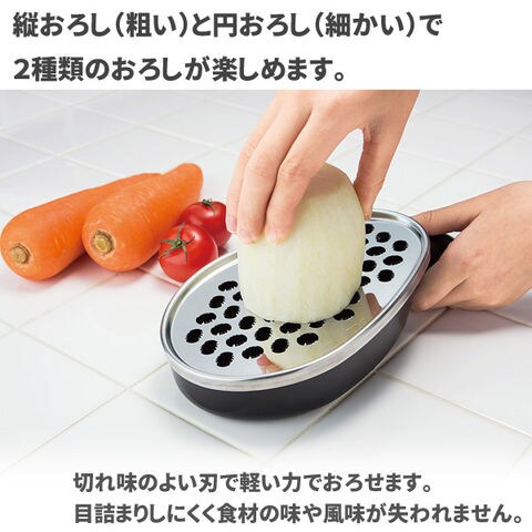 縦おろし(粗い)と円おろし(細かい)で2種類のおろしが楽しめます。 切れ味のよい刃で軽い力でおろせます。目詰まりしにくく食材の味や風味失われません。 |