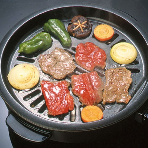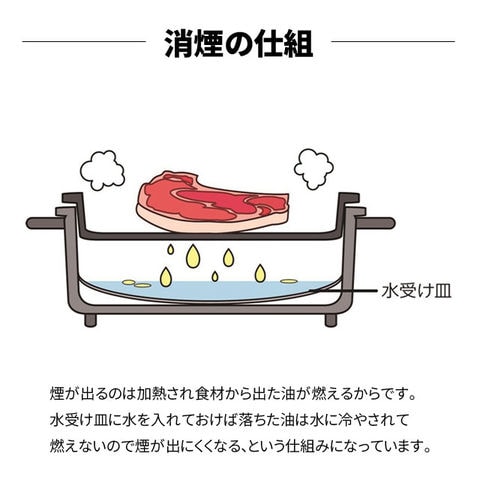 | ◆脂がプレートの穴から水受け皿に落ちるので煙が出にくい構造です。 ◆余分な脂を落としてヘルシーに焼き上げます。 | |