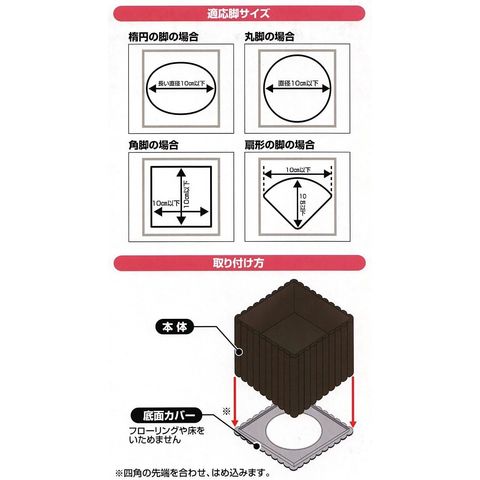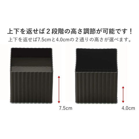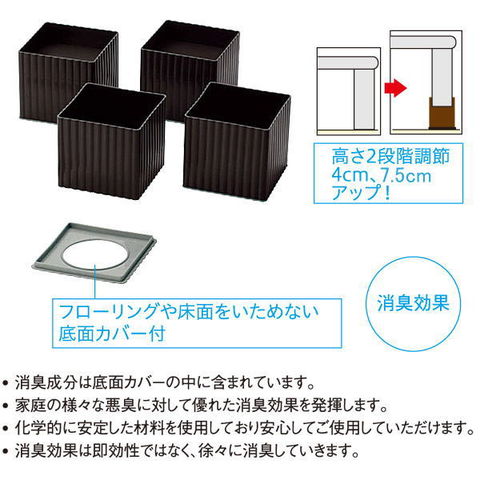 | 暮らしにスペースをプラス。 ベッド・テーブル・机などの足につけるだけで高さがアップします。 従来品よりも強度の強い材料を使用しており、耐久性がアップしました。 空いたスペースに収納ケースを収めたり、ロボット掃除機が通るスペースを作れます。 上下を裏返すことで、2段階の高さ調整が可能です。(4cmと7.5cmの2段階) 振動や脚の動きを抑えるスベリ止め付。 消臭成分は底面カバーの中に含まれています。 家庭の様々な悪臭に対して優れた消臭効果を発揮します。 科学的に安定した材質を使用しており安心してご使用していただけます。 消臭効果は即効性ではなく、徐々に消臭していきます。 | |
