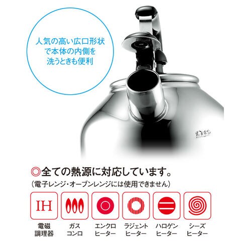 全ての熱源に対応した3.6リットルの定番のやかん。広口でお手入れも簡単です。内側を洗うときも便利。丈夫で衛生的なステンレス製。お湯の沸騰を笛でお知らせ。お湯を沸かすのに最適なサイズ。