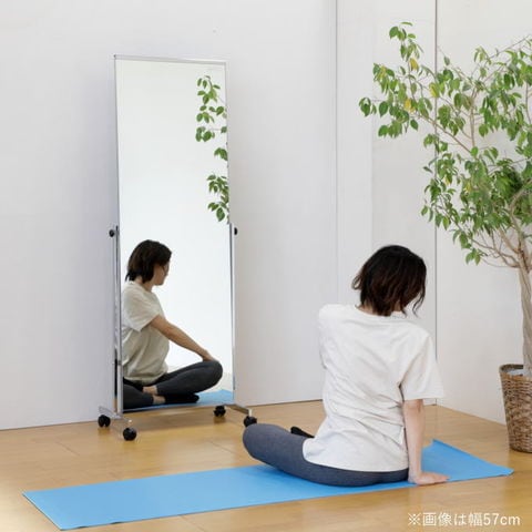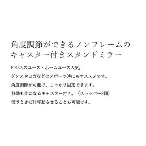 | ノンフレームタイプのスタンドミラーで、ビジネスユース・ホームユースに人気の商品。 ダンスやヨガなどのスポーツ時にもおすすめです。 角度調節が可能で、固定ノブでしっかり固定できます。 移動も楽にできるキャスター付き。(キャスター2個はストッパー付き) 使うときだけ移動させる事も可能です。 |
