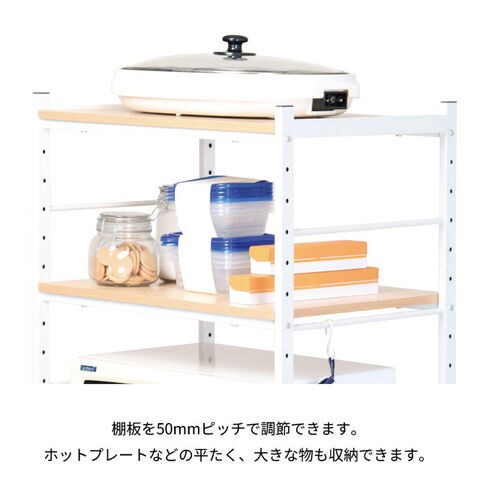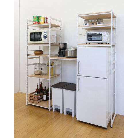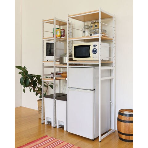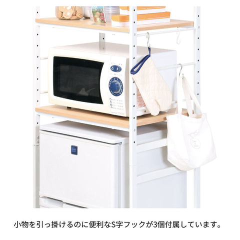 台所をすっきりと収納。 1人暮らしにおすすめの冷蔵庫の上にレンジや食品を収納できる収納ラック。 棚板を50mmピッチで調整できます。 小物を引っ掛けるのに便利な“S字フック”が3個付属しています。 ホットプレート等の平たく、大きな物も収納できます。 |