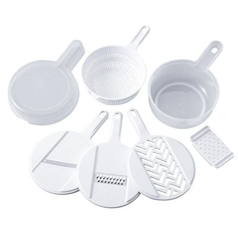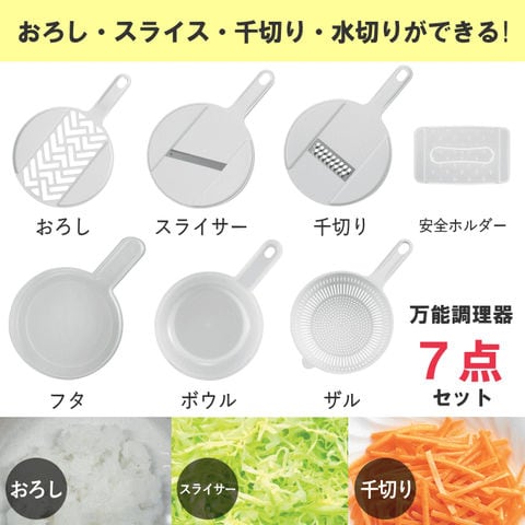 | おろし・スライス・千切り・水切りができるボウル・ザル・フタ・おろし・スライサー・千切り・安全ホルダーの7点セット。 |