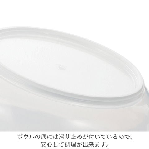 | ボウル・ザル・フタ・安全ホルダー/ポリプロピレン(耐熱温度110度) ボウル滑り止め/熱可塑性エラストマー(耐熱温度100度) 調理プレート/ABS樹脂(耐熱温度80度) 刃物/ステンレス鋼 |