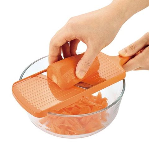 | 均一な厚さの短冊切りができる! 皮をむいた大根や、にんじん、山芋をスライスすると短冊切りができます。 安心の日本製です。 | |