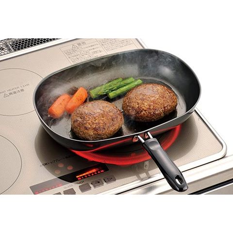 | 鉄製オーバルフライパンを使って健康、不足しがちな鉄分補給を手助け! ●鉄鍋から溶け出る鉄分は体内への吸収率が高く、鉄分不足を補う重要な手段として注目されています。 一般的な鉄鍋では、一回の調理で約1~2mg程度(成人1人1日当たり摂取目安10~12mg)の鉄分が溶け出すといわれています。 オーバル型だからお魚も焼けます! | |