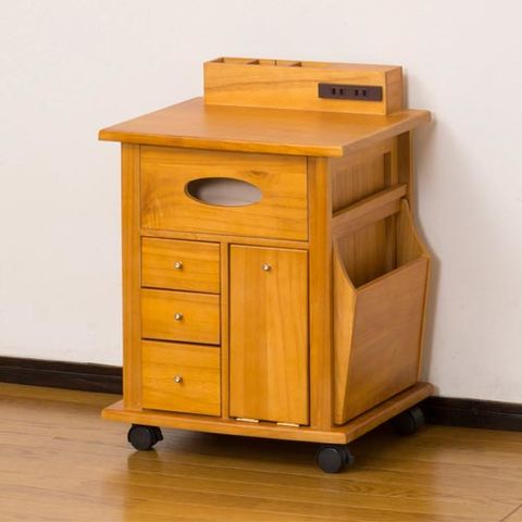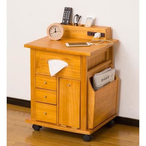 ナイトワゴン 64837 ナイトテーブル 機能的 サイドテーブル ボックスティッシュ収納 ゴミ箱付 北欧 木製 引き出しコンセント付キャスター付き 雑誌 ワゴン マガジンラック クロシオ