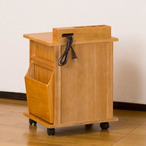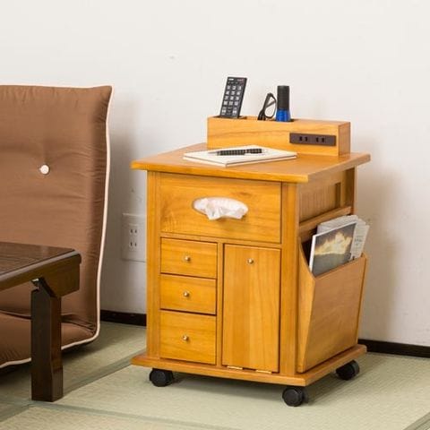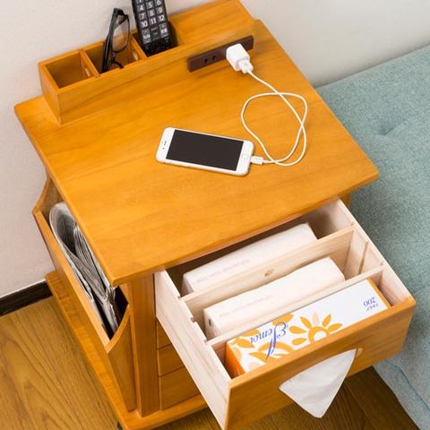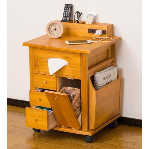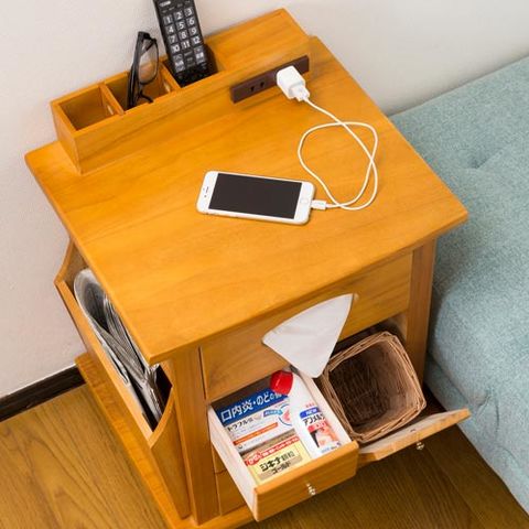 | 整理収納アドバイザー監修商品 ベッド周辺の必要な物が1ヶ所にまとまり、コンセント付で充電もでき、ライトも使えます。 手を伸ばしてティッシュを使い、ゴミ箱へポイ!が便利。キャスター付で移動ラクラク。 マガジンラックは左右どちらでも取付可能です。 リモコン・眼鏡・携帯電話などは収納ポケットが便利!見える位置にまとめて置けるので安心です。 | |