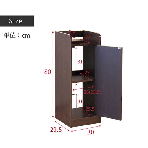 | サイズ | (約)幅30×奥行29.5×高さ80cm 扉内棚板は固定棚 扉内内寸 上部/(約)幅26(23.5)×奥行23×高さ31cm 下部/(約)幅26(23.5)×奥行25.5×高さ31cm 空間内寸 天板上/(約)幅26×奥行27×高さ8cm |
