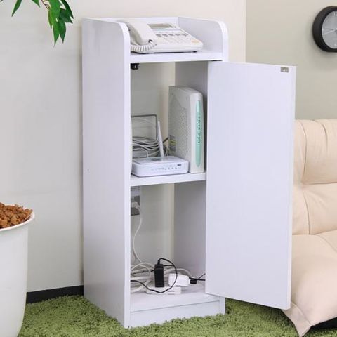 | 幅が約30cmとスリムなので、お部屋のスミや家具のスキマに設置できます。扉内はモデムやルーター、光電話の機器、タップなどまとめて収納でき、乱雑になりがちなコードをスッキリ整理できます。またA4ファイルや電話帳を立てて収納することもできます。 | |