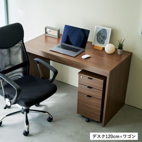 | リアルな木目調の天板は、ブラウンとナチュラルの2色展開。熱や傷に強いメラニン天板です。 3段の引出しを備えており、鍵をかけられます。鍵をかけると全ての引出がロックされます。 デスク下に置けるサイズ設定で、キャスター付で移動も楽なため、デスク下から取り出してワゴンの天板を作業スペースとして使うことも可能です。 引き出しの取っ手はマットブラックでスタイリッシュな印象です。 |