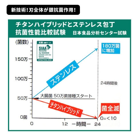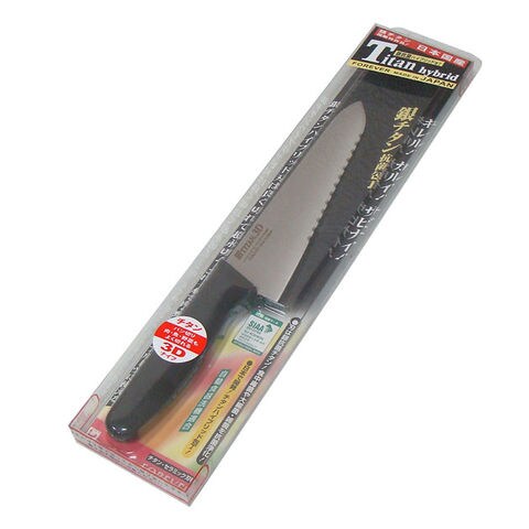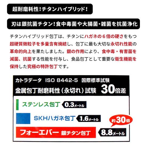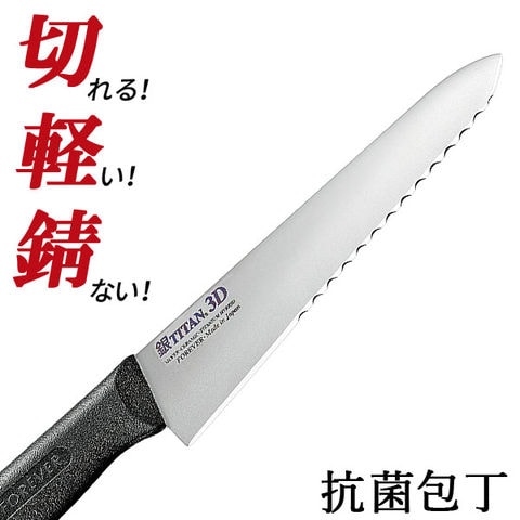 | 家庭包丁これ1本で!軽い、錆びない、抗菌刃の包丁です。3D特許刃形効果で食材を軽く、きれいに切ることができます 【3D包丁の切れ味】 食材に切り込みを入れる場合、通常包丁に対して直線運動で食材を切りますが、3D包丁は直線部と波刃部が交互につながっている為、直線運動時に波刃の凸凹による斜めの運動が発生し、刃と食材の締め付け圧力が排除されるので食材を軽く、きれいに切ることができます。 【超耐磨耗性!チタンハイブリッド】 チタンハイブリッド包丁は、チタンにハガネの6倍の硬さをもつ超硬質微粒子を多量含有焼結し、包丁に最も大切な永切れ性能の革命的向上を果たしました。銀の作用により、食中毒・有害菌を減菌、抗菌する性能を付与し、食品包丁として重要な衛生機能を保持した究極の特許包丁です。 【サビない】 食品ならば何を切ってもサビません。 【軽い】 一般のステンレス包丁やハガネ包丁と比べて、約45%軽量です。 【金属アレルギーがない】 チタンは無害安全な実用金属!アレルギーのないチタンは人工骨や歯根にも使われています。 | |