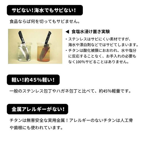| 仕 様 | 刃渡り:160mm 食洗機使用可 チタン合金複組成刃物 特許第3593414号 |