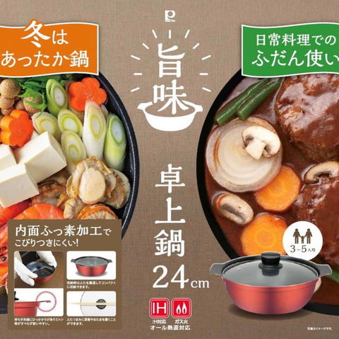 | ◆優れた耐久性でキズに強い、内面フッ素コーティング。 ◆トマト鍋やカレー鍋、キムチ鍋などベッタリこびりつきやすいお鍋からよせ鍋などの定番のお鍋まで、いろいろなメニューを楽しめます ◆ガス火はもちろん、IHクッキングヒーターやハロゲンヒーターなどオール熱源に対応しているので、カセットコンロ・IH調理器を使って卓上で楽しめます。 ◆3~5人用サイズ。 ◆中の様子が見えるガラス蓋付。 ◆ガラス蓋のツマミは菜箸やお玉が置ける形状になっています。 ※2024/02/14 仕様変更 |