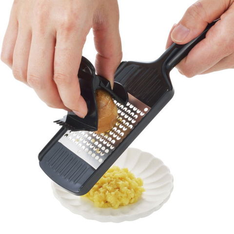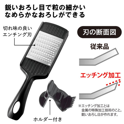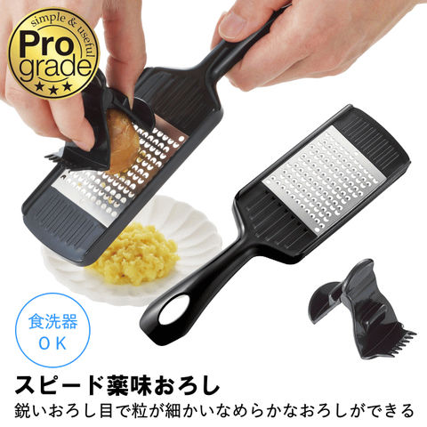 | ご家庭にプロの料理を 本格調理シリーズプログレード 鋭いおろし目で粒の細かいなめらかなおろしができる。 切れ味の良いエンチング刃を使用。 ホルダー付きで食材をしっかりおろしできます。 食洗器OK |