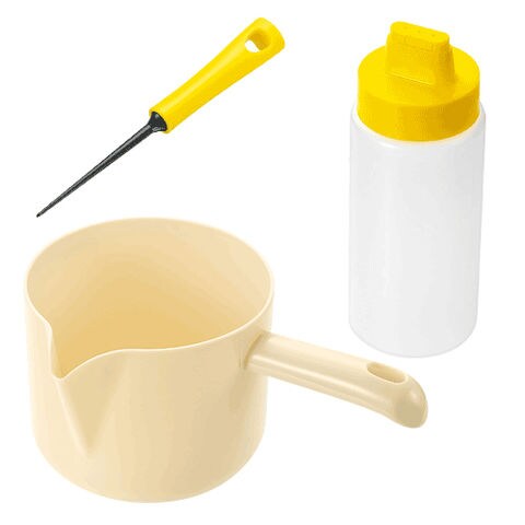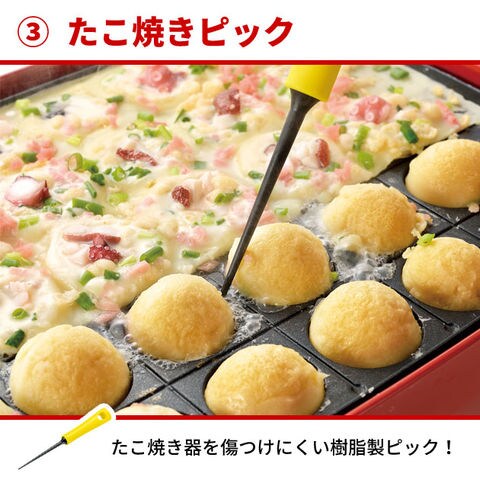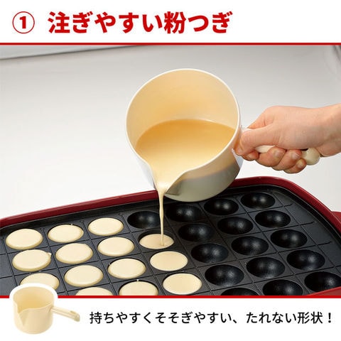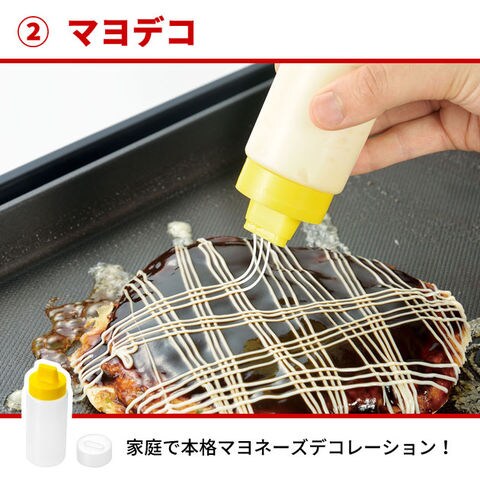 | 材 質 | 粉つぎ:本体/ポリプロピレン(耐熱温度:110℃) マヨデコ:本体/ポリエチレン(耐熱温度:60℃)、キャップ・カバー:ポリプロピレン(耐熱温度:110℃) たこ焼きピック:本体/ナイロン(ガラス繊維入り)(耐熱温度:230℃)、ハンドル/ポリプロピレン(耐熱温度:110℃) |