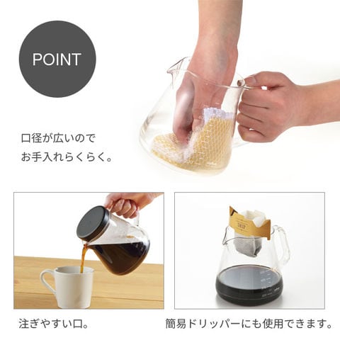 | ガラスのように透明なのに、割れにくい。丈夫なコーヒーができました。 ・軽くて使いやすく、電子レンジOK! ・注ぎやすい口。 ・口径が広いので、お手入れらくらく。 ・簡易ドリッパーも使用できます。 | |