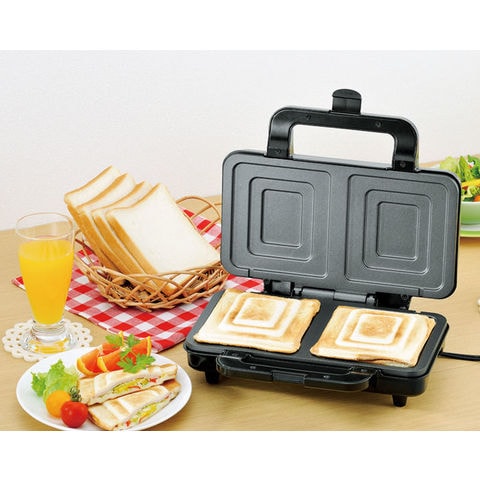 | 切らずいそのまま使えるホットサンドメーカー。 食パンのサイズに合わせた形状で、食パンの耳を切らずにそのままつかえます。 一度に2個作れます。うれしいレシピ付きです。 | |