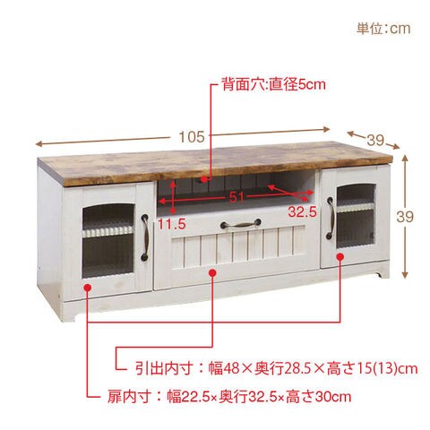 | サイズ | (約)幅105×奥行39×高さ39cm 扉内寸(2ヶ所):(約)幅22.5×奥行32.5×高さ30cm 背面穴(2ヶ所):(約)幅15×高さ10cm 可動棚小2枚(3.2cmピッチ3ヶ所移動) 空間内寸:(約)幅51×奥行32.5×高さ11.5cm 背面穴:(約)直径5cm 引出内寸:(約)幅48×奥行28.5×高さ15(13)cm |