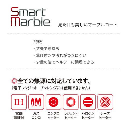 見た目も美しいマーブルコート ・丈夫で長持ち ・焦げ付きや汚れがつきにくい ・少量の油でヘルシーに調理できる |