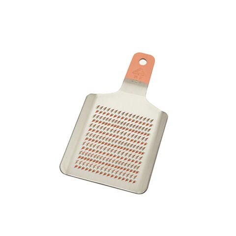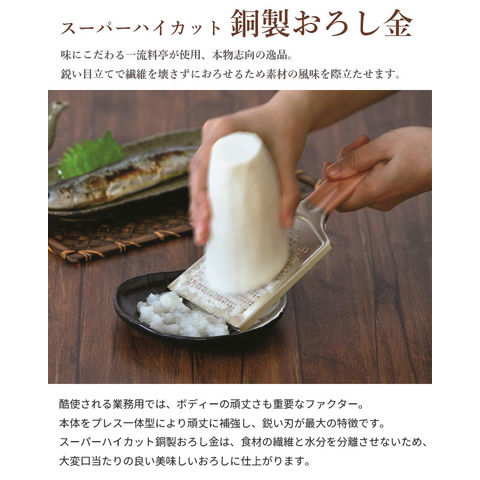 味にこだわる一流料亭が使用、本物志向の逸品。鋭い目立てで繊維を壊さずにおろせるため素材の風味を際立たせます。 酷使される業務用では、ボディーの頑丈さも重要なファクター。本体をプレス一体型により頑丈に補強し、鋭い刃が最大の特徴です。 スーパーハイカット銅製おろし金は、食材の繊維と水分を分離させないため、大変口当たりの良い美味しいおろしに仕上がります。 |