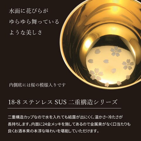 | 水面に花びらがゆらゆら舞っているような美しさ。 内側底には桜の模様入りです。 18-8 ステンレス SUS 二重構造シリーズ 二重構造カップなので水を入れても結露が出にくく、温かさ・冷たさが長持ちします。内面に24金メッキを施してあるので金属臭がなく口当たりも良くお酒本来の本淳な味わいを堪能していただけます。 メイド・イン・ツバメ 新潟県燕市で生産された製品の原産地に認証された商品に「メイド・イン・ツバメ」のロゴマークを使用しています。日本はもとより世界中で燕製品が愛用されています。燕の工場がお客様のことを想いながら丹精込めて製造された商品であること。安心と高品質をお客様に約束するマークです。 | |
