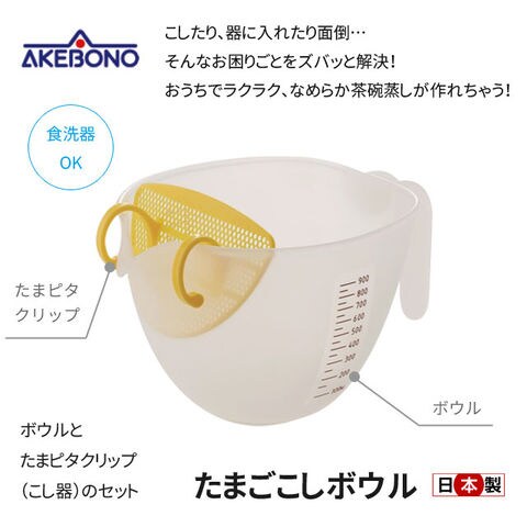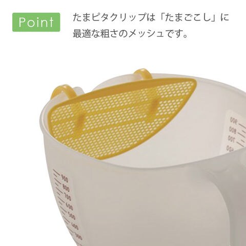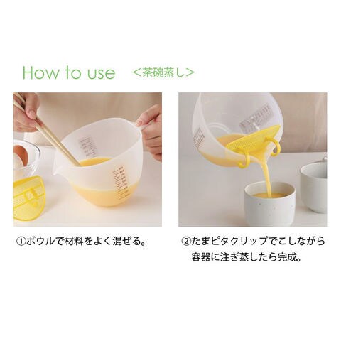 | こしたり、器に入れたり面倒…。そんなお困りごとをズバッと解決! おうちでラクラク、なめらか茶碗蒸しが作れちゃう! プリン作りにも! 【ポイント】 ・注ぎやすい口。 ・たまピタクリップは「たまごこし」に最適な粗さのメッシュです。 | |