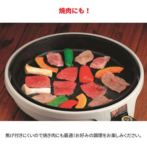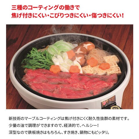 | 新技術の3層マーブルコーティングは、焦げ付きにくく耐久性抜群の素材。少量の油で調理が出来、ヘルシーで経済的。 深型だから鉄板焼きはもちろん、すき焼き、鍋物にもピッタリ。 プレートは取り外して水洗いOK! | |