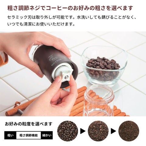 | 挽きたて、新鮮な風味を楽しむ組み合わせ 石臼型セラミック刃をゆっくり挽くことで、熱をもたず酸化しにくいのでコーヒー本来の風味を楽しめます。 粗さ調節ネジでコーヒー豆のお好みの粗さを選べます。 セラミック刃は取り外し可能です。水洗いしても錆びることがなく、いつでも清潔にお使いいただけます。 | |