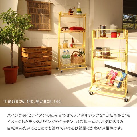 パインウッドとアイアンの組み合わせでノスタルジックな”自転車かご”をイメージしたラック。リビングやキッチン、バスルームに。お気に入りの自転車みたいにどこにでも連れて行けるお部屋にかわいい相棒です。