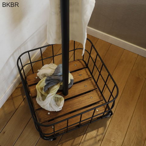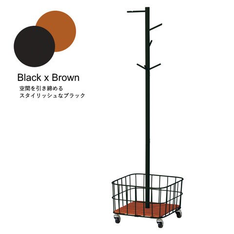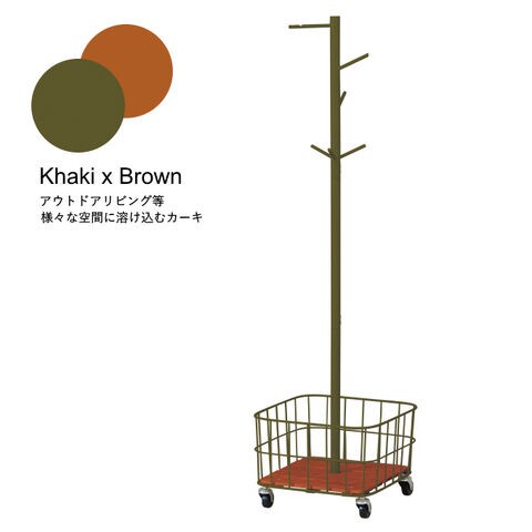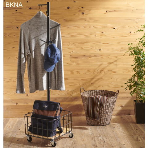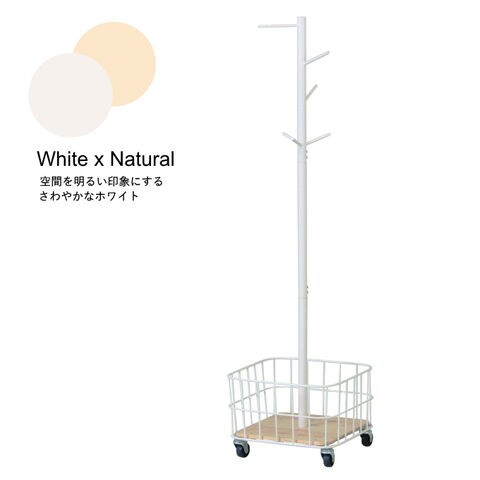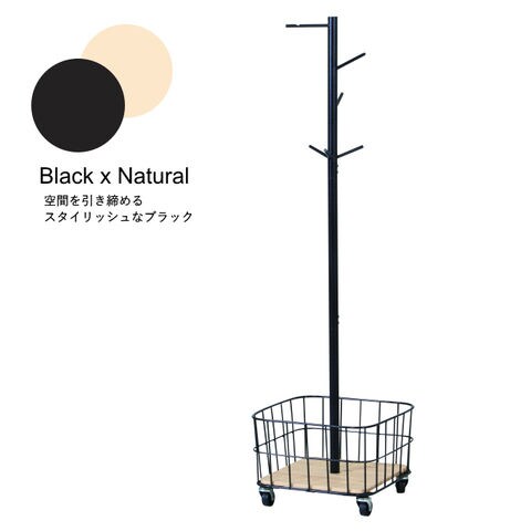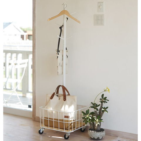 | デッドスペースになりがちなポールの下にカゴを設け、収納スペースとしてご使用いただけます。またハンガーを掛けられるよう、上部の水平バーには凹みを施しております。 かごの下には動かしやすいようキャスターが付いています。 |