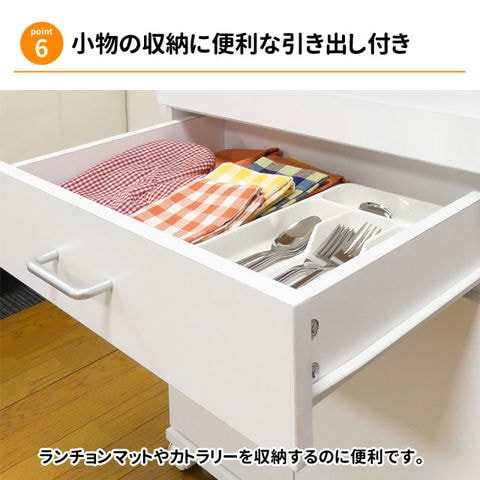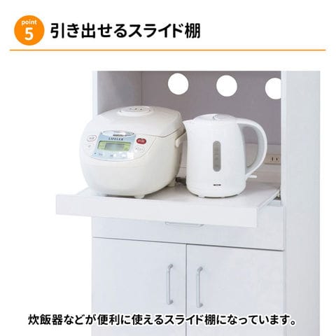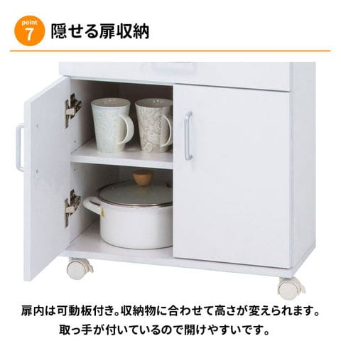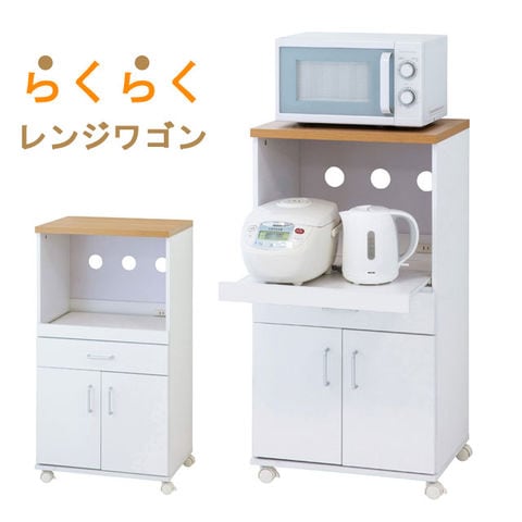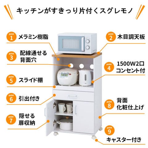 | 置き場に困っていたキッチン家電をスッキリひとまとめにできるレンジワゴン。 耐熱性・耐水性に優れ、キズにも強いメラミン素材を使用していますので安心してご使用いただけます。 省スペース設計でコンパクトサイズなのに収納力は抜群!一人暮らしの方にもおすすめです。 使う時だけ引き出せるスライド棚や、可動棚で収納物に合わせて移動でき、食器やかさばる鍋も収納できる扉収納などその機能にも満足できるキッチンワゴンです。 | |